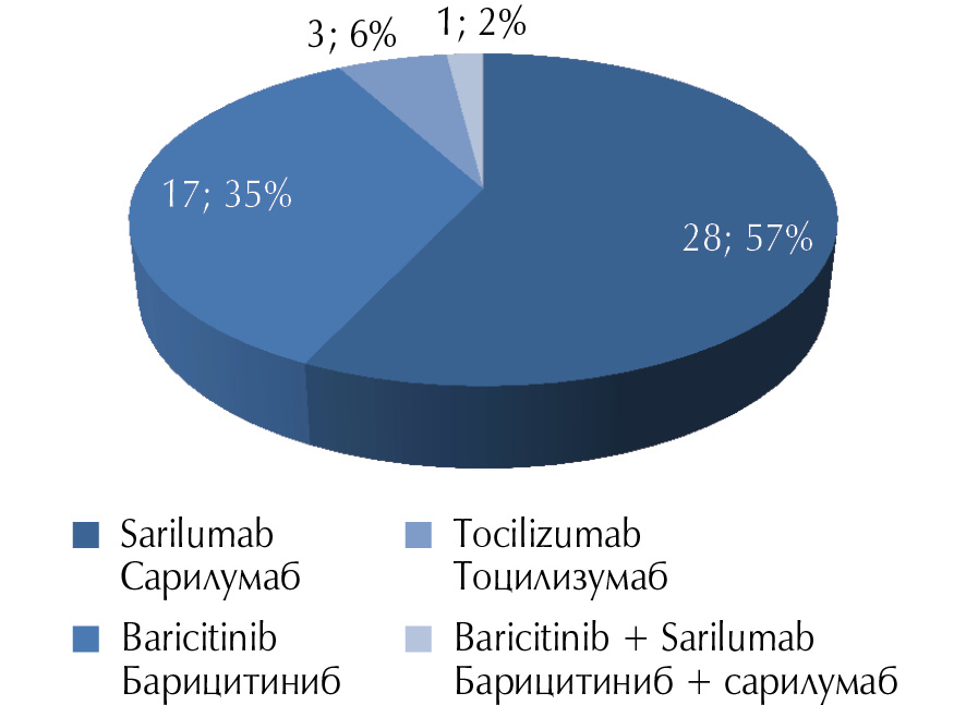 ADCS were administered in 49 patients (38.0%), and sarilumab was prescribed most frequently (in 57% of cases) (Fig. 6).