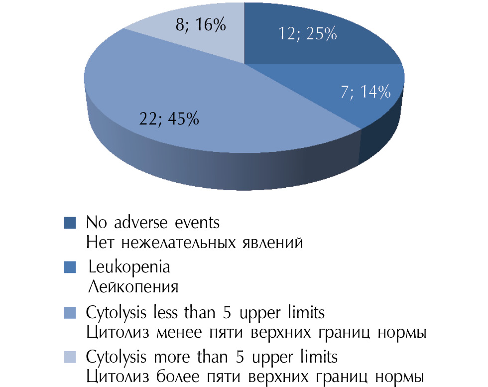 The development of adverse events was evaluated using ADCS. The frequency and structure of the most frequent laboratory adverse events are shown in Fig. 7. Cytolytic syndrome was considered the most frequent laboratory adverse event, which was detected in 61% of patients (30 patients), whereas in most cases (73.3%), cytolysis was <5 upper limits of the norm.