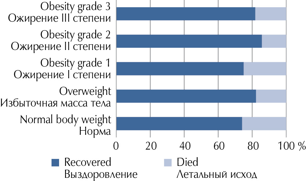Results. Fatal outcomes were significantly more frequently recorded among patients of older age groups and males. The presence of concomitant diseases such as obesity, diabetes mellitus, pathology of the cardiovascular system was accompanied by more frequent fatal outcomes. That allows considering comorbidity as a risk factor for severe course and poor prognosis of COVID-19. However, in general, in the presence of the indicated forms of concomitant diseases, it was not possible to establish significant differences with the outcomes of COVID-19, which may be due to an insufficient amount of patients. Predictors of fatal outcome was low values of saturation, the presence of respiratory failure, a significant amount of lung tissue damage (CT-3-4), as well as high values of CRP, ferritin, AST, D-dimer, neutrophilia, lymphopenia, thrombocytopenia. The use of anticytokine drugs (ACD) in complex therapy can be considered a favorable predictor of outcome, which indicates the advisability of wider use. The materials of the study allow not only a preliminary assessment of the course and effectiveness of complex therapy using anticytokine drugs with COVID-19 in patients with comorbid diseases, but also to develop therapeutic and diagnostic algorithms in patients of this category.