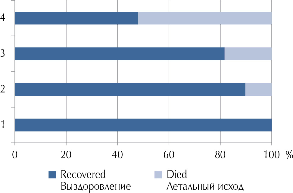 The proposed mechanisms of the development of a multiple organ failure are multifactorial and include hypercoagulation with the formation of blood clots in both micro- and macrocirculatory channels. The development of DIC is a serious predictor of death (occurring among 71.4% of patients with a fatal outcome and among 0.6% of survivors) [11, 12].
