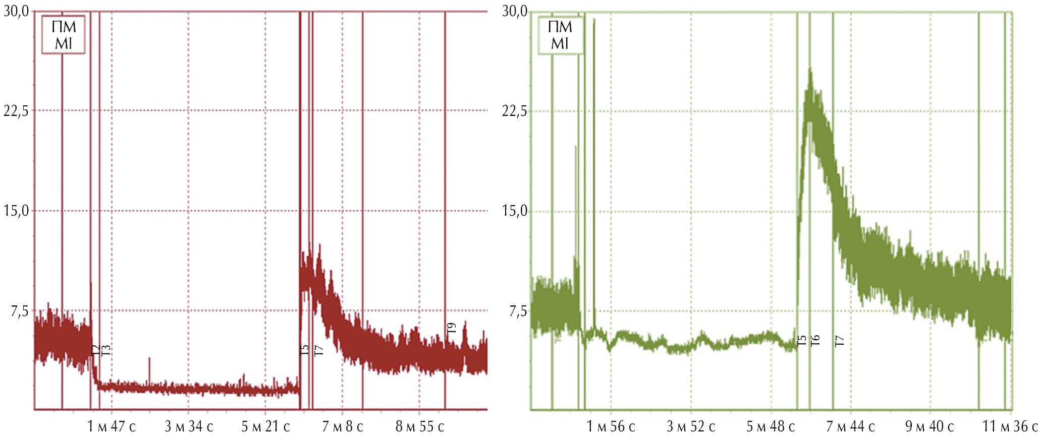 Рис. 1. Проба с артериальной окклюзией при лазерной допплеровской флоуметрии. ЛДФ-грамма до (слева) и после (справа) пробы с кратковременной артериальной окклюзией. Область исследования — локус передней поверхности дистальной трети кожи предплечья. По оси абсцисс расположены значения показателя микроциркуляции (ПМ), измеренные в перфузионных единицах, по оси ординат — временная шкала