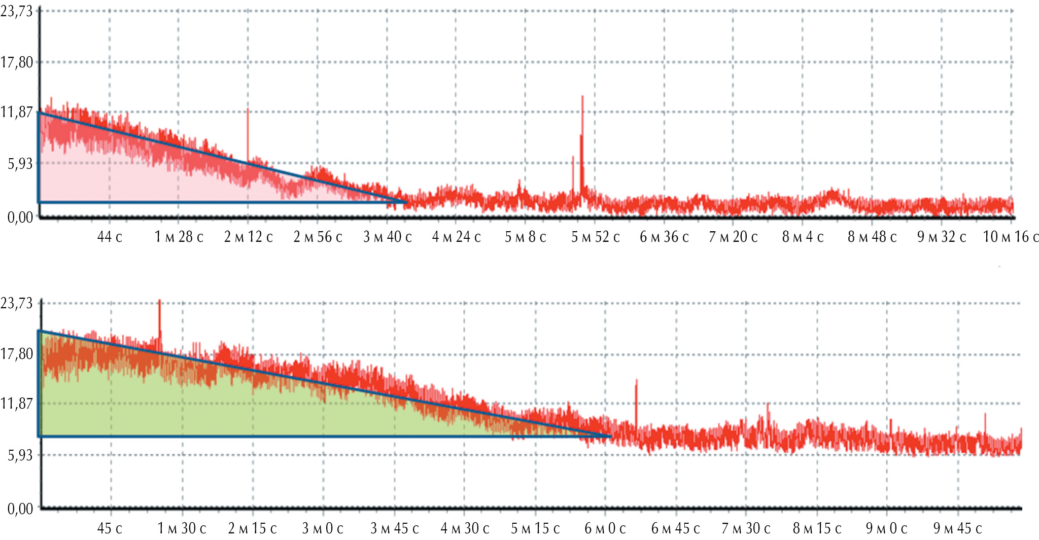 Рис. 2. Проба с ионофорезом 0,1 % раствора ацетилхолина при лазерной допплеровской флоуметрии. ЛДФ-грамма до (сверху) и после (снизу) аппликации 0,1 % раствора ацетилхолина. Область исследования — локус передней поверхности дистальной трети кожи предплечья. По оси абсцисс расположены значения показателя микроциркуляции, измеренные в перфузионных единицах, по оси ординат — временная шкала