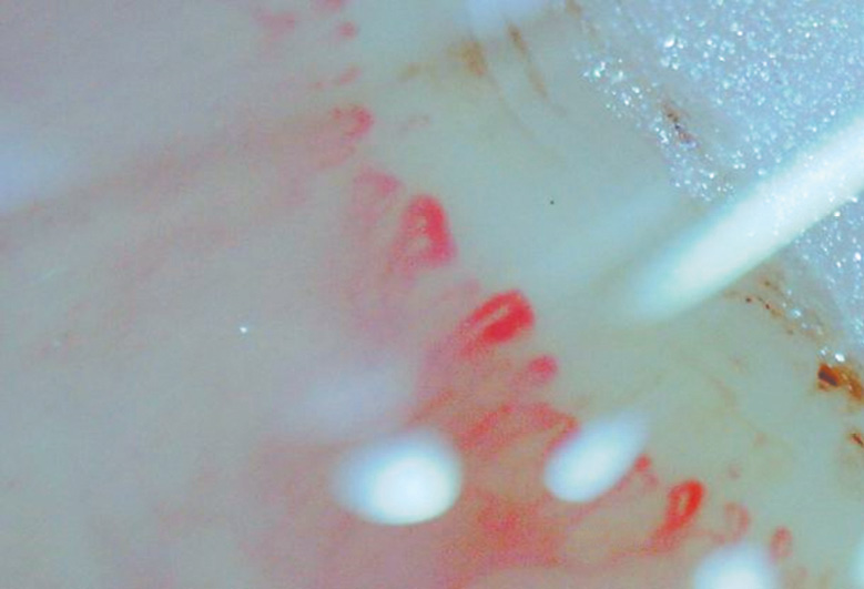 NFC was performed using a DigiMicro Lab 5.0 digital microscope. Lesions of the microvasculature were assessed according to the proportions of the parameters of sclerodermic patterns (such as giant capillaries, “loss” of capillaries, microhemorrhages, and capillary branching). Three main patterns are generally accepted in the standards of capillaroscopic research technique, namely, early, active, and late (Figs. 1–4).