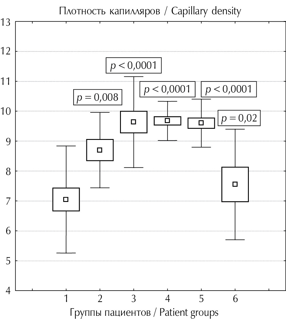 Fig. 10. Comparison of capillary density in different groups ( — mean; — mean error; — mean deviation, p — relative to the group with systemic scleroderma). The patient groups: 1 — with systemic scleroderma; 2 — with idiopathic pulmonary hypertension; 3 — control group; 4 — with osteoarthritis; 5 — with rheumatoid arthritis; 6 — with dermato/polymyositis