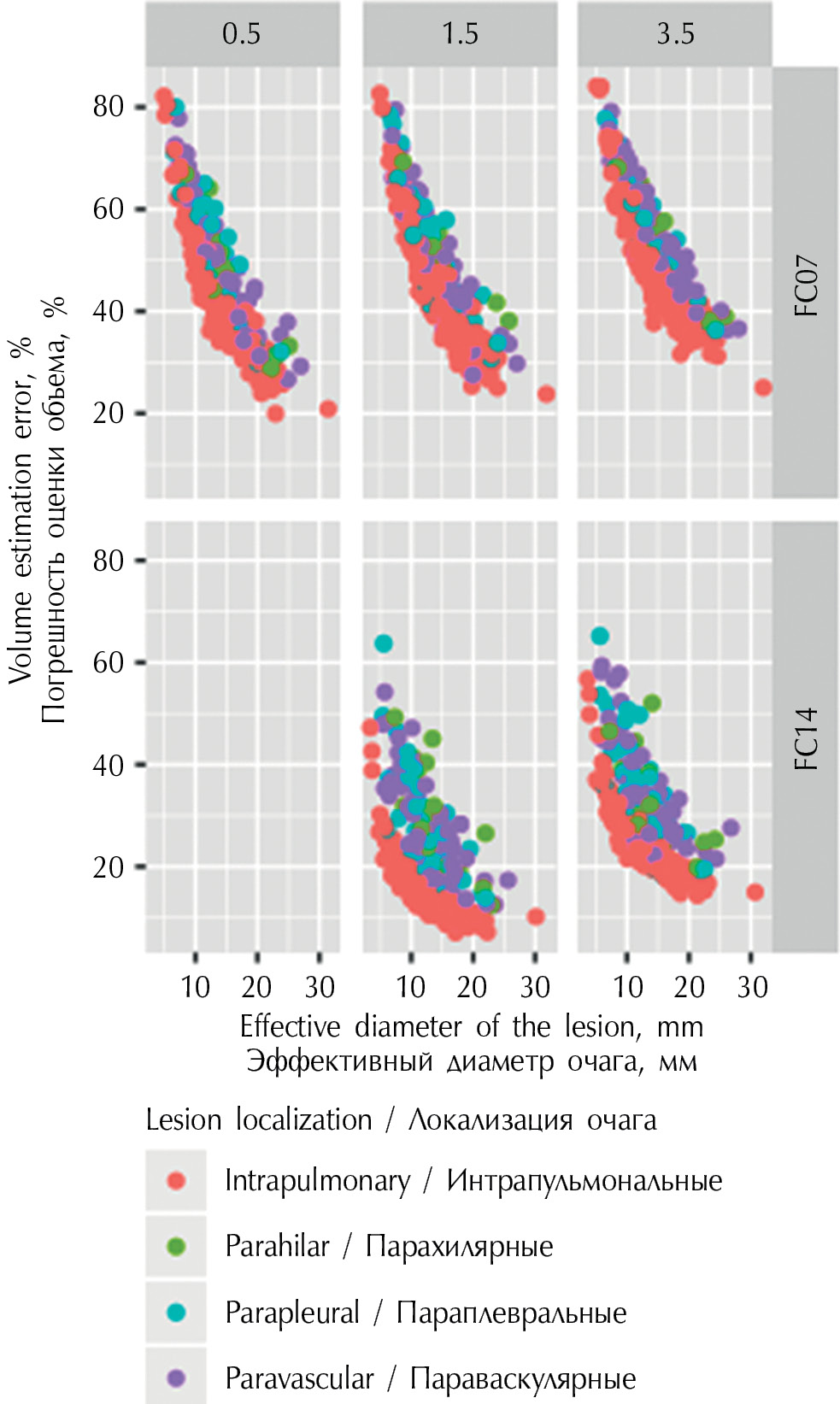 Materials and methods. 32 patients with pulmonary metastases underwent a CT scanning with 326 foci detected. 326 pulmonary were segmented. Volumetry error was estimated for every lesion with each combination of slice thickness and reconstruction kernel. The effect was measured with linear regression analysis