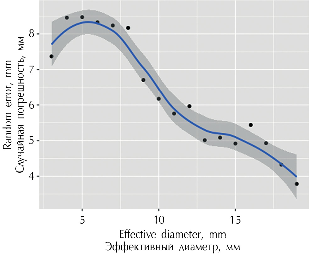 Рис. 2. График зависимости случайной погрешности оценки объема от эффективного диаметра очага