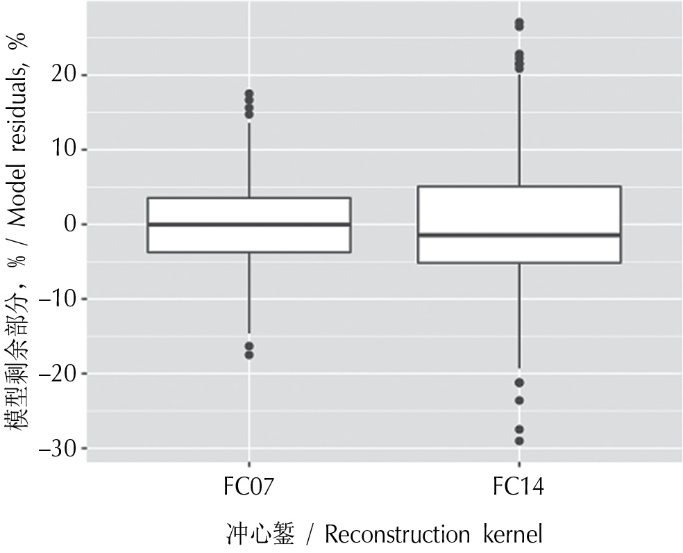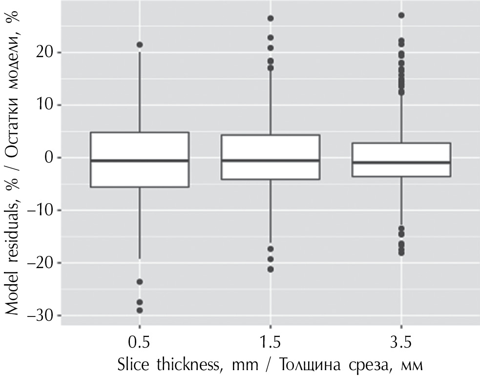 All model coefficients were statistically significant (p < 0.001). The coefficient of the model determination was 0.85, and the standard error of the model was 6.7%. A relationship was found among the standard deviations of the model residuals (stochastic error), focus diameter, slice thickness, and reconstruction kernel (Fig. 2).