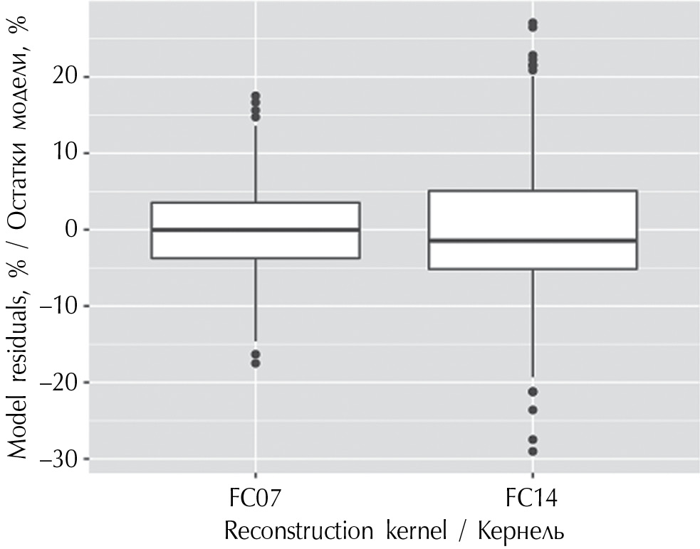 According to our data, the use of the FC07 kernel when assessing the focus volume with a diameter of 10 mm is associated with an increase of 26% in the systematic error and of 7% in the stochastic error. During case follow-up, if the first images were obtained using FC14 and the second images were obtained using FC07, the volume of the focus must increase by at least 26 + 7 = 33% so that the registered changes can be taken as a significant increase. A difference of less than 26 – 7 = 19% means that the focus has not increased, but decreased.