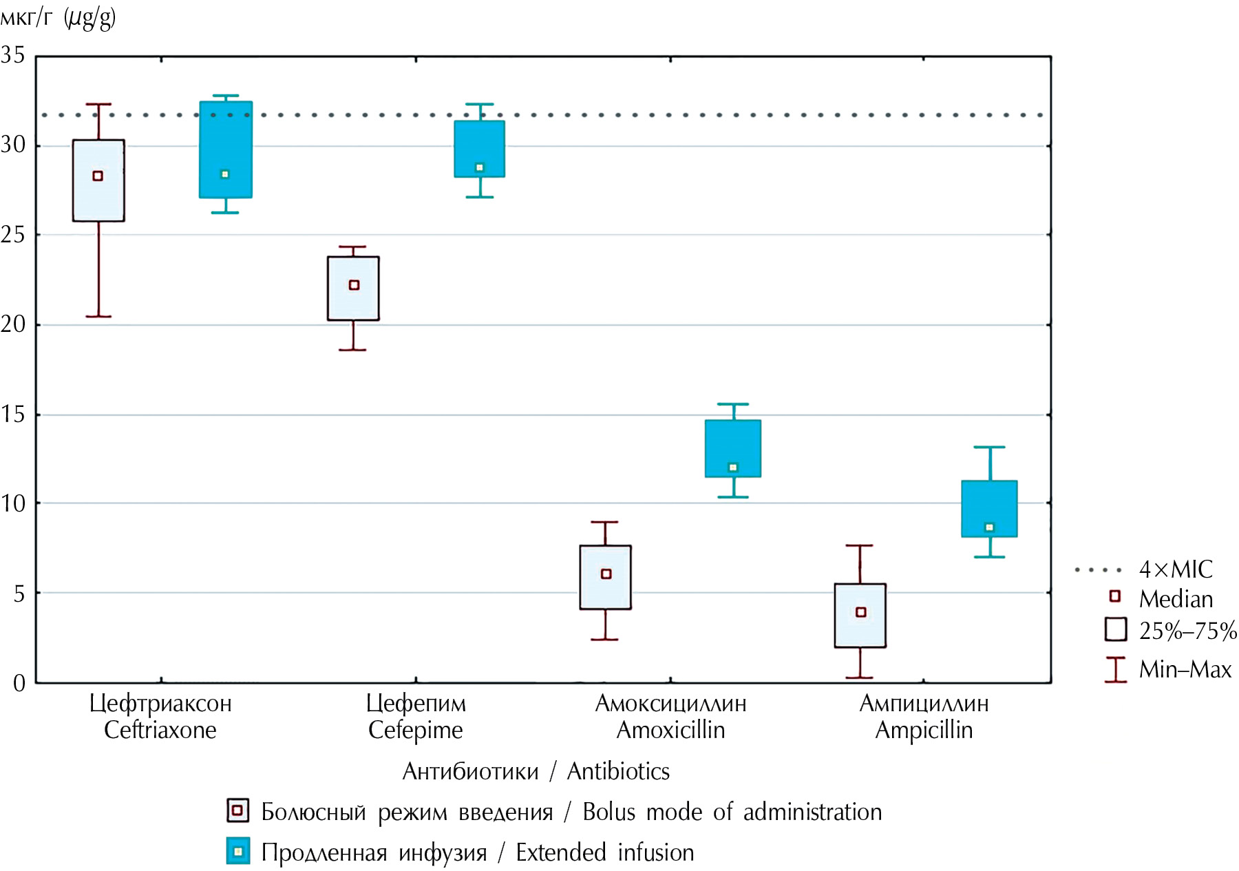 At the same time, for all modes of administration, the “critical” level of 4 × MIC of the drugs under study was not achieved. Only in patients who received ceftriaxone and cefepime in the extended infusion mode, the concentration of antibiotics in the uterine cavity was close to the target value,