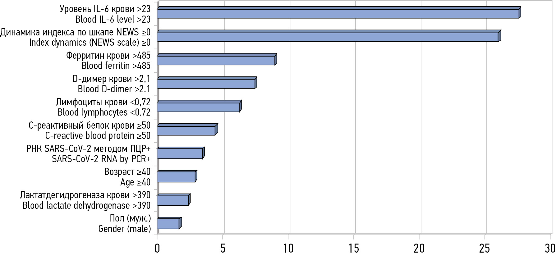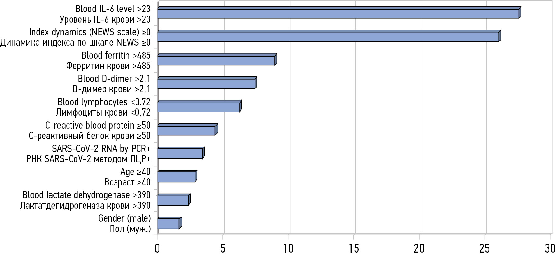 Exceeding the threshold values of the main predictors of CS was significantly more frequently observed in Group 2 (Table 6). Subsequently, a comprehensive assessment of the CS risk was carried out with the ranking of parameters, which, in accordance with the rank of prognostic significance obtained by the CT method, by the beginning of CS therapy were as follows: dynamics of the index according to the NEWS scale, IL-6 level >23 pg/ml; CRP level ≥50 mg/l; absolute lymphocyte count <0.72 ∙ 109/l, positive result of SARS-CoV-2 RNA test, and age ≥40 years. These biomarkers can be used as criteria for assessing the risk of CS. Gender differences were not significant in the subsequent comprehensive assessment of the risk of CS development.