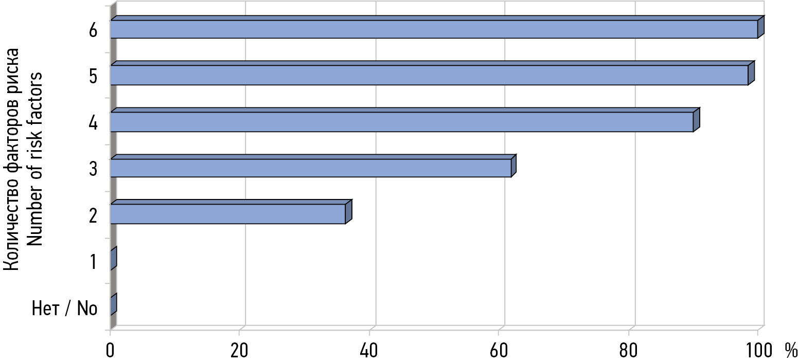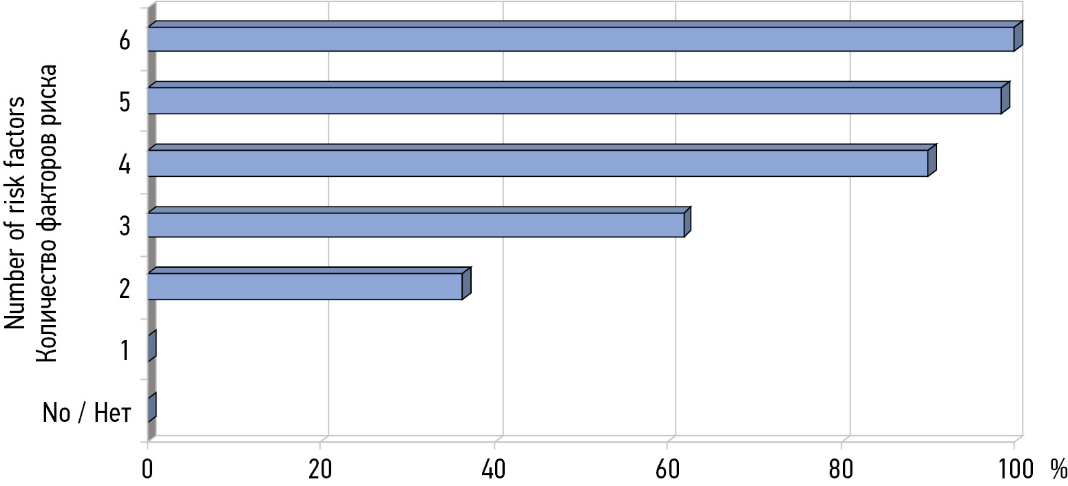 An increase in the frequency of CS cases correlates with an increase in the number of risk factors (correlation coefficient Rg = +0.91, р < 0.001) (Table 6, Fig. 2). Any of the above factors, in combination with the largest number of other factors, increased the risk of developing CS.