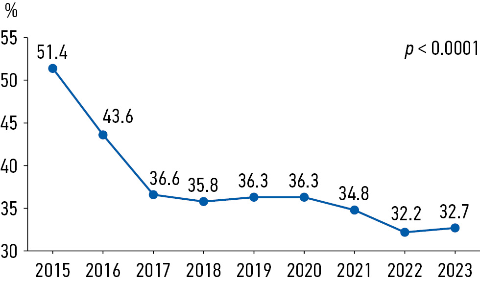Рис. 1. Изменение показателя инфицированности Helicobacter pylori у первичных пациентов с 2015 по 2023 г.