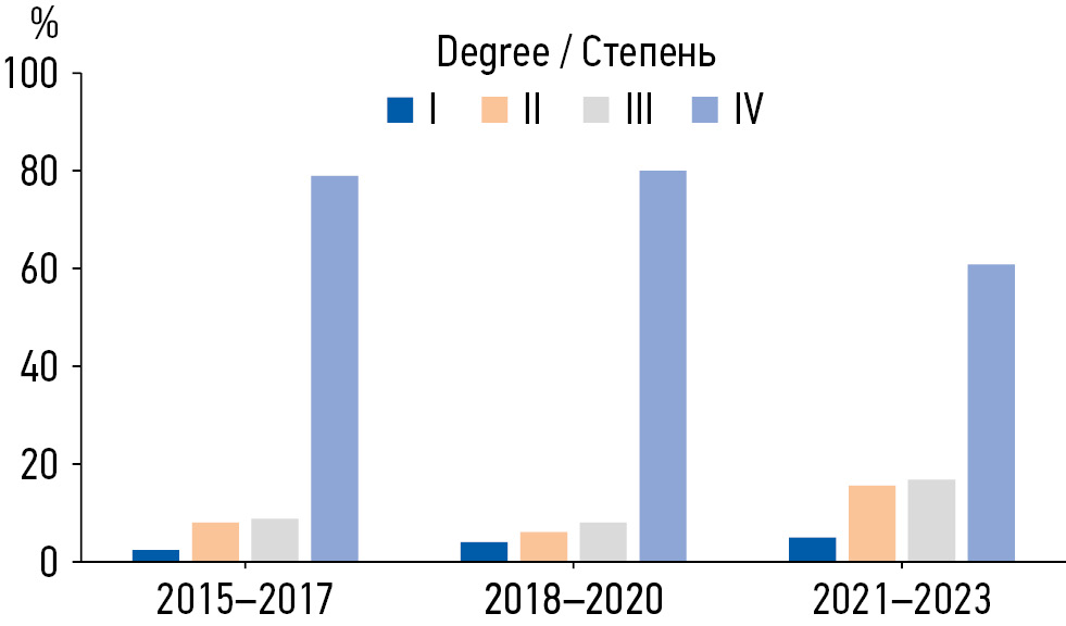The infection rates in the recurrent patients decreased during the time triads, amounting to 17.8% for 2015–2017, 16.0% for 2018–2020, and 12.9% for 2021–2023. Notably, the indicator decreased nearly threefold from 39.1% to 13.2% during 2015–2023 (Fig. 4) when analyzing the infection rate in recurrent patients. The most significant decrease occurred from 2015 to 2016 (by 19.3%) and from 2020 to 2021 (by 5.1%). The proportion of infected patients decreased by 6.7% from 2020 to 2023.