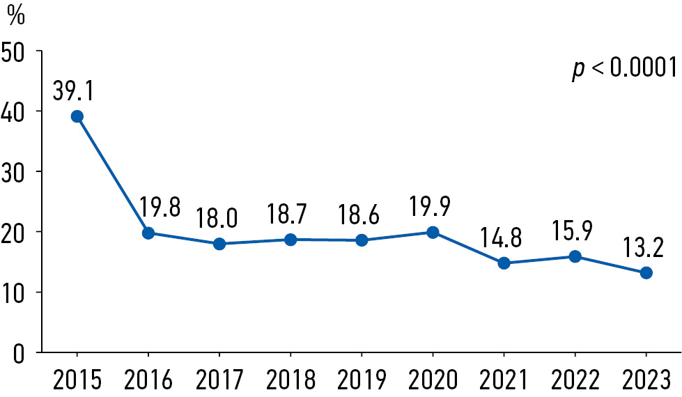 The infection rates of all groups decreased between 2015 and 2023. The infection rates were 14.8% and 21.1% between 2015 and 2017, respectively, and 3.6% and 6.2% between 2020 and 2023, respectively.