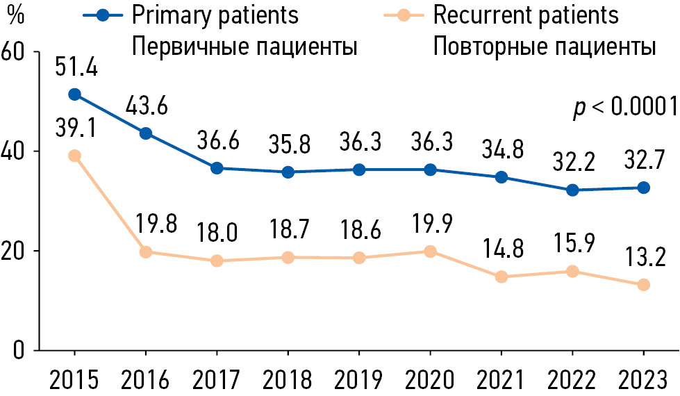 Рис. 4. Изменение показателя инфицированности Helicobacter pylori у первичных и повторных пациентов с 2015 по 2023 г.