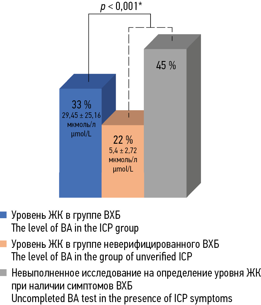 В исследовании М. Majsterek и соавт. (2022) повышенные постпрандиальные показатели ЖК (более 10 мкмоль/л, гиперхоланемию) после приема пищи наблюдали менее чем в 40 % бессимптомных беременностей [14], причем уровни ЖК при ВХБ могли более чем в 100 раз превышать референсные значения.