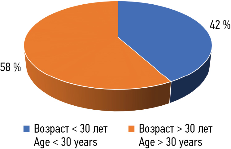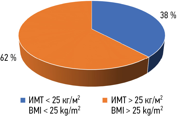 Таким образом, в исследование включено 60 пациенток с диагностированным ВХБ в среднем возрасте 31,6 ± 5,87 года. Верифицированный ВХБ чаще всего встречался у женщин старше 30 лет — в 58 % случаев (n = 35) (рис. 5). Проанализирован профиль пациенток в зависимости от индекса массы тела (ИМТ), рассчитанного и внесенного в медицинскую документацию на ранних сроках беременности (до 8 нед.). Среднее значение ИМТ пациенток с ВХБ составило 26,67 ± 4,71 кг/м2, в 62 % (n = 37) случаев ИМТ превышал 25 кг/м2 (рис. 6).