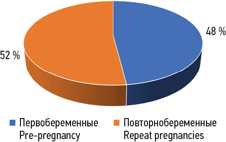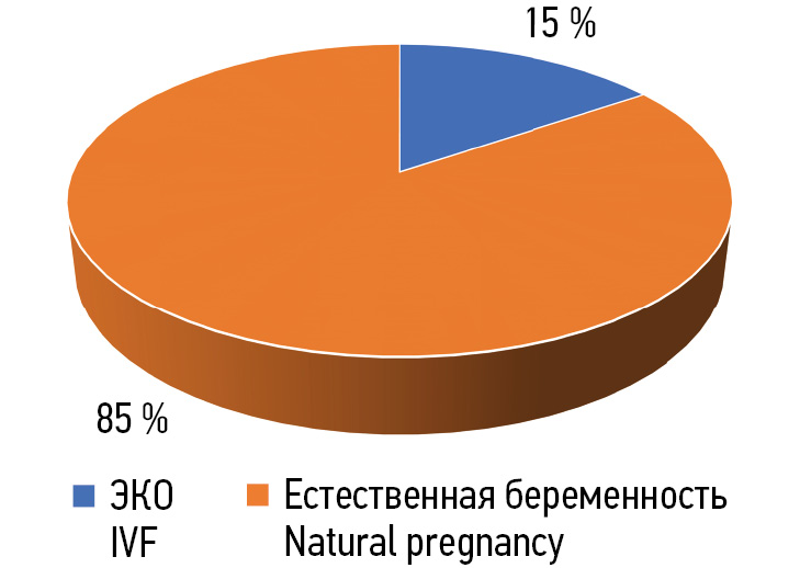 Пациентки с первой беременностью составили 48,3 % (n = 29), повторнобеременные — 51,7 % (n = 31) (рис. 7). У 85 % (n = 51) беременность была естественной, у 15 % (n = 9) — наступила в результате экстракорпорального оплодотворения (рис. 8).