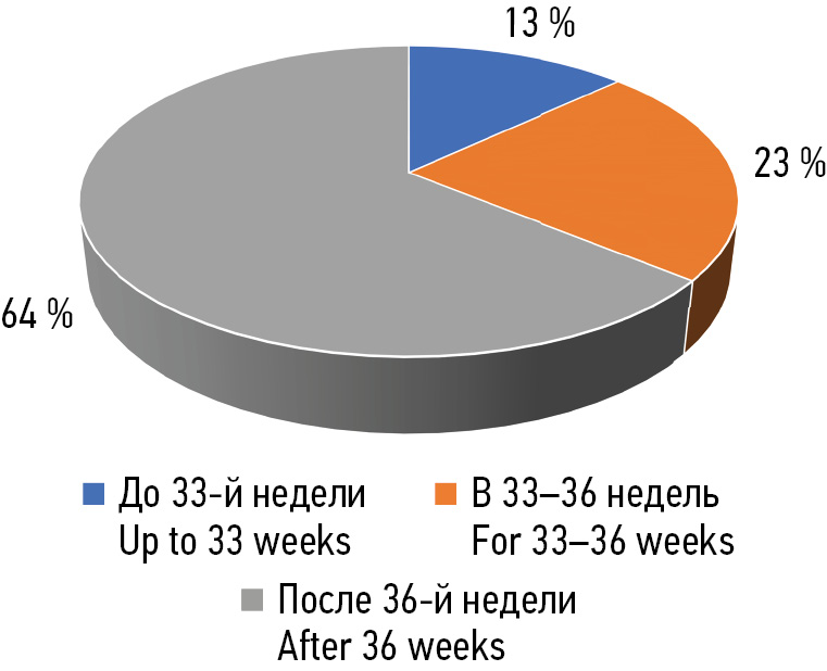 Среднее значение срока гестации при появлении клинико-лабораторных проявлений холестаза составило 36,33 ± 3,38 нед. У большинства пациенток ВХБ дебютировал после 36-й недели беременности — в 63,4 % случаев (n = 38) (рис. 9).