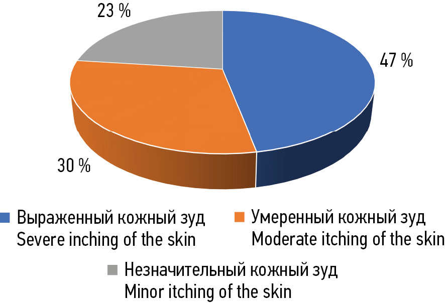 Среди проанализированных в настоящем исследовании пациенток кожный зуд отмечен у 58,5 % (n = 107) женщин, однако у 39 % (n = 48) — ВХБ не был верифицирован. У пациенток с верифицированным ВХБ кожный зуд встретился в 100 % (n = 60) случаев и был разделен на незначительный — у 23,3 % женщин (n = 14), умеренный — у 30 % (n = 18) и выраженный — у 46,7 % (n = 28).