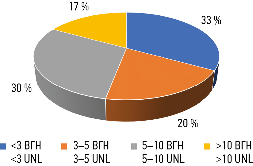 Повышение уровня аланинаминотрансферазы (АЛТ) и аспартатаминотрансферазы (АСТ) наблюдали у большинства обследованных пациенток: в группе с верифицированным ВХБ — в 100 % (n = 60) случаев, в группе сравнения — в 63,4 % (n = 116), значимость различий между группами составила p = 0,000083. Средний уровень маркеров цитолиза в группе с верифицированным ВХБ, в частности АЛТ, составил 5,7 ± 4,6 верхней границы нормы (ВГН). Активность АЛТ менее 3 ВГН отмечена у 33,3 % (n = 20) пациенток (p = 0,001), 3–5 ВГН — у 20 % (n = 12; p = 0,18), 5–10 ВГН — у 30 % (n = 18; p = 0,007), более 10 ВГН — у 16,7 % (n = 60; p = 0,003). Однако у большинства пациенток степень выраженности цитолиза была минимальной [менее 3 ВГН — у 33,3 % (n = 20) женщин] или умеренной [5–10ВГН — у 30 % (n = 18)] (рис. 12). В группе пациенток с неверифицированным ВХБ активность АЛТ была менее 3 ВГН в 46,3 % (n = 57) случаев, 3–5 ВГН — в 24,4 % (n = 30), 5–10 ВГН — в 20,3 % (n = 25), более 10 ВГН — в 9 % (n = 11). Среднее значение АЛТ в данной группе составило 4,39 ± 3,13 ВГН, значимость различий между группами — p = 0,11.