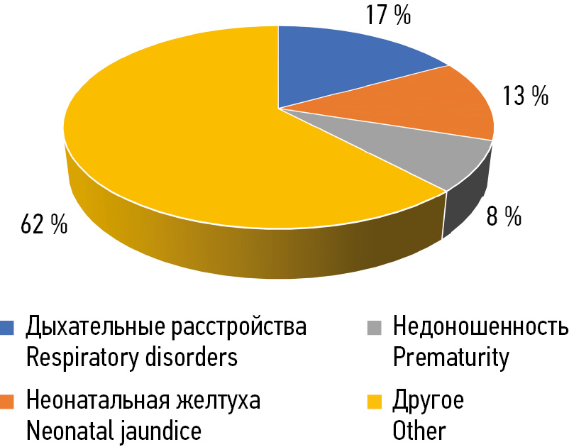 Проанализированы патологии новорожденных от матерей с диагностированным ВХБ. Встречались различные варианты дыхательных расстройств — у 16,7 % детей (n = 10; p = 0,003), неонатальная желтуха — у 13,3 % (n = 8; p = 0,9), недоношенность — у 8,3 % (n = 5; p = 0,19) (рис. 13).