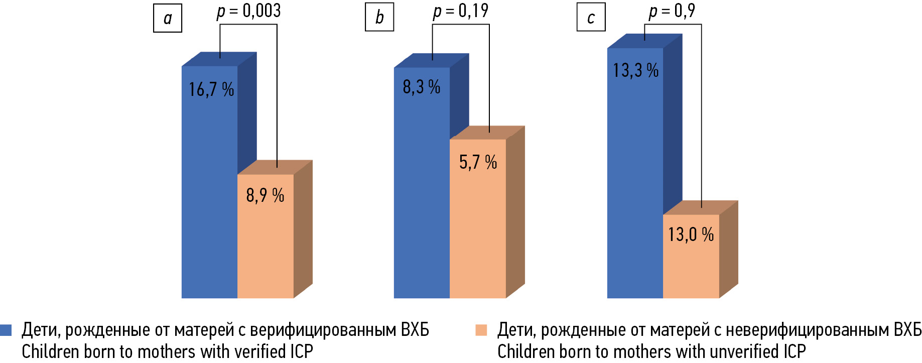 Осложнения новорожденных отмечены как в группе с верифицированным ВХБ, так и в группе сравнения. У детей, рожденных от матерей с верифицированным ВХБ, выявлены следующие осложнения: недоношенность — в 8,3 % случаев (n = 5), неонатальная желтуха — в 13,3 % (n = 8), дыхательные расстройства — в 16,7 % (n = 10). У детей, рожденных от матерей с неверифицированным ВХБ обнаружены: недоношенность — в 5,7 % случаев (n = 7), неонатальная желтуха — в 13,0 % (n = 16), дыхательные расстройства — в 8,9 % (n = 11). Выявлено значимое преобладание дыхательных расстройств у детей, рожденных от матерей с верифицированным ВХБ, в сравнении с показателем у детей от матерей с неверифицированным ВХБ (p = 0,003) (рис. 14, а).