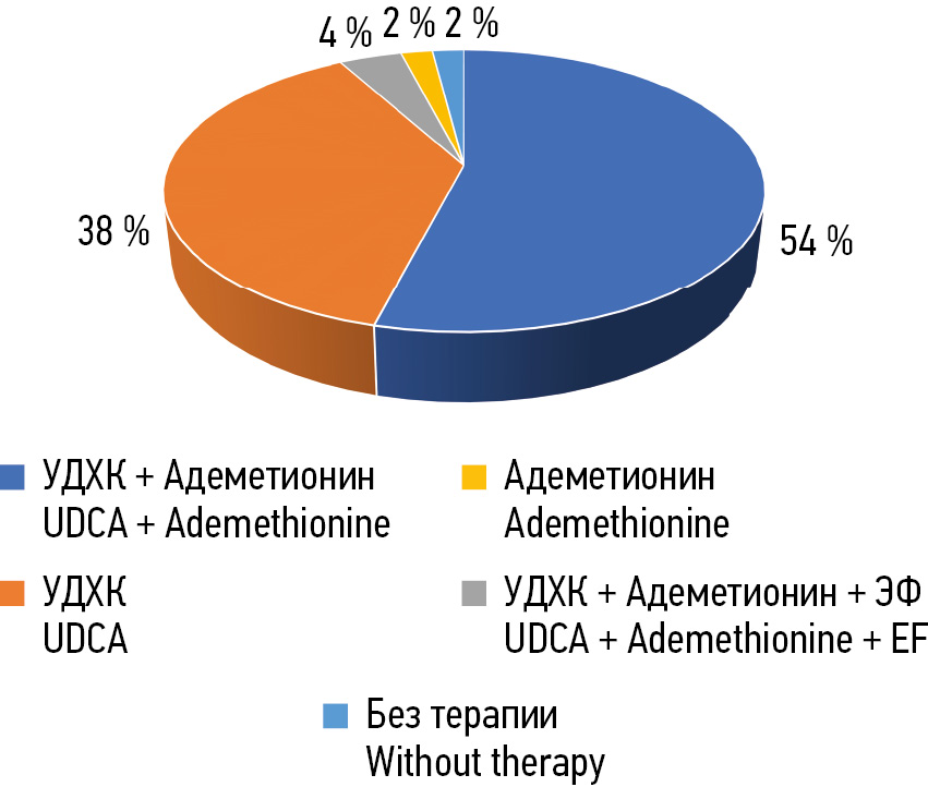 Анализ терапевтических подходов при ВХБ показал, что при манифестации клинических симптомов пациенткам в 54 % (n = 32) случаев назначали медикаментозную терапию в виде комбинации УДХК и адеметионина, а в 38 % (n = 28) — монотерапию УДХК. Кроме того, обращает на себя внимание, что у 2 % больных терапию не проводили, вероятно, по причине низкой выраженности зуда.