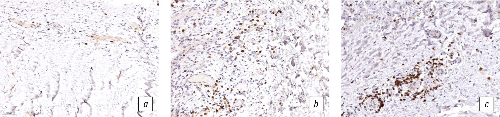 Рис. 2. Биоптаты синовиальных оболочек. Иммуногистохимическая реакция с антителами: a — к CD3 (Т-лимфоциты); b — к CD20 (B-лимфоциты); c — к CD68 (макрофаги), продукт реакции коричневого цвета. Инфильтрация соединительной ткани синовиальной оболочки: слабая (a) умеренная (b) и выраженная (c). Масштабный отрезок 50 мкм. Докраска гематоксилином Майера
