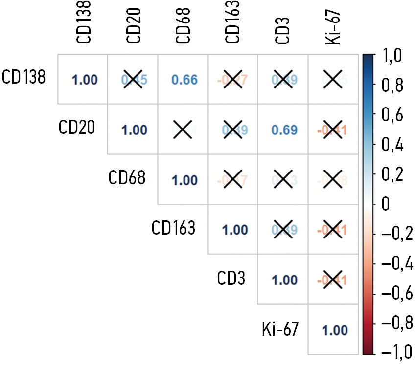 Выраженной воспалительной инфильтрацией характеризовались 10 % синовиальных оболочек, умеренной — 30 % и слабой/отсутствующей — 60 %. Отмечена также взаимосвязь между T-лимфоцитами (CD3+) и B-лимфоцитами (CD20+), плазмоцитами (CD138+) и М1-макрофагами (CD68+), что согласуется с данными корреляционного анализа. В то же время инфильтрация М2-макрофагами (CD163+) была менее зависима от других клеток воспалительного инфильтрата.