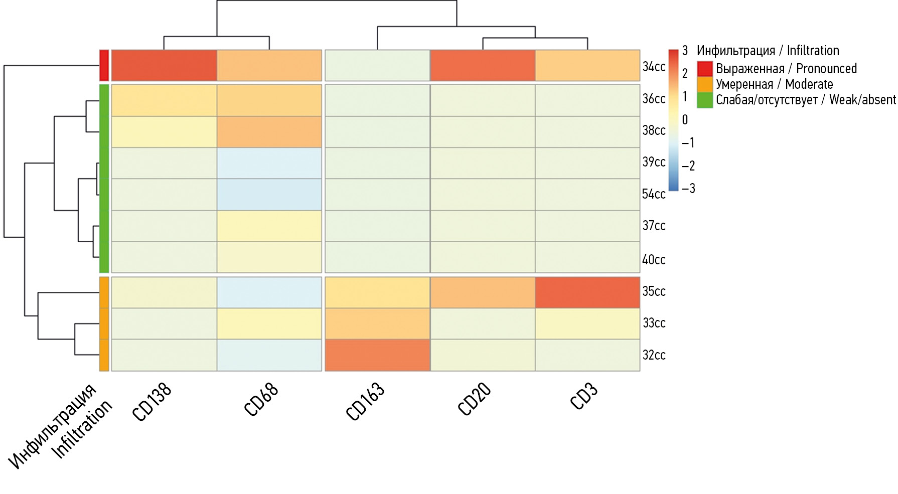 Как следует из рис. 3, количество T-лимфоцитов (CD3+) коррелирует с уровнем B-лимфоцитов (CD20+) (r = 0,69; p < 0,05), а М1-макрофаги (CD68+) — с уровнем плазмоцитов (CD138+) (r = 0,66; p < 0,05). Несмотря на значимость корреляций, данный анализ не передает выраженность воспалительной инфильтрации и ее специфику. Для классификации синовиальных оболочек по степени выраженности воспалительного инфильтрата и описания его особенностей построена тепловая карта (рис. 4).