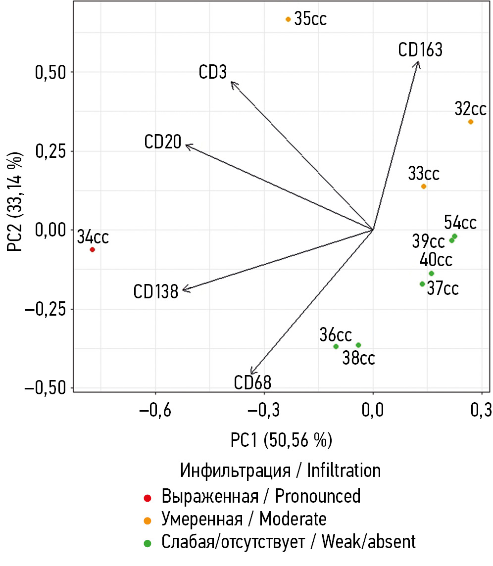 По степени выраженности воспалительной инфильтрации выделены три кластера. Наибольшее влияние на выраженное воспаление оказывали Т-лимфоциты (CD3+), B-лимфоциты (CD20+), плазмоциты (CD138+) и М1-макрофаги (CD68+). М2-макрофаги были описаны в части случаев слабой инфильтрации и характеризовали высокий индекс пролиферативной активности. В 33,3 % случаев умеренной инфильтрации наибольший вклад в ее структуру вносили плазмоциты, Т-лимфоциты и М2-макрофаги.