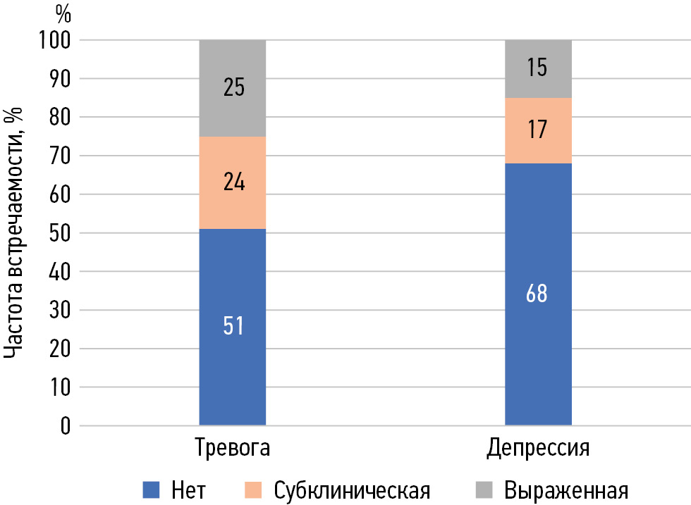 2. Рис. 1. Частота встречаемости тревоги и депрессии различных степеней тяжести у согласно госпитальной шкале тревоги и депрессии (Hospital Anxiety and Depression Scale, HADS).