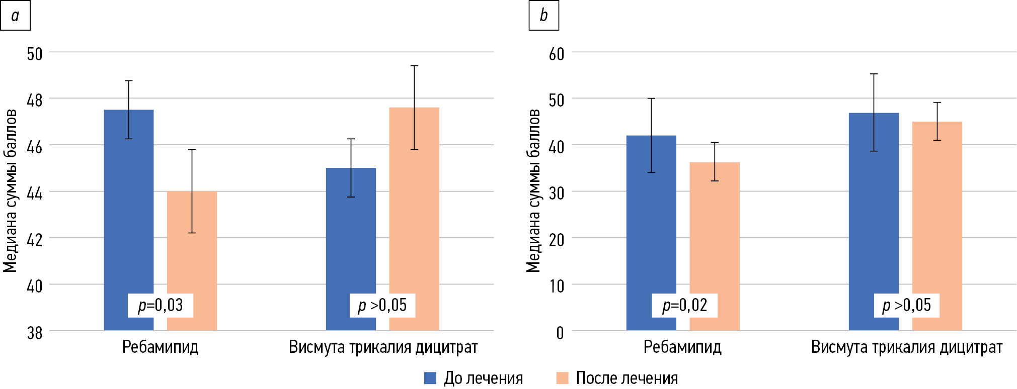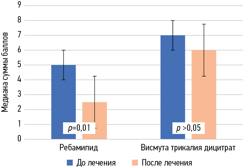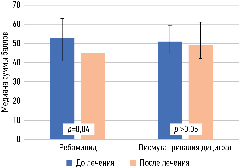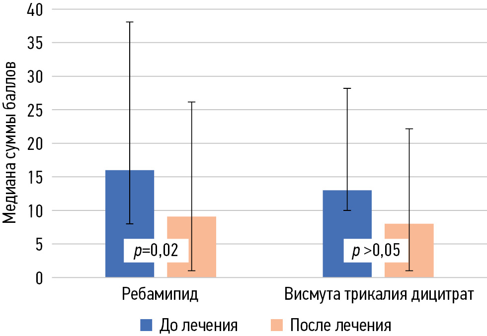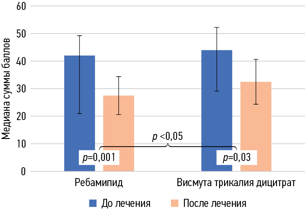 Исследуемые пациенты случайным образом были распределены на две сопоставимые группы. В дополнение к стандартной спазмолитической терапии больные группы 1 получали цитопротективную терапию ребамипидом (PRO.MED.CS Praha a.s., Чешская Республика) в дозе 300 мг/сут, пациенты группы 2 — цитопротективную терапию препаратом висмута (висмута трикалия дицитрата по 480 мг/сут). Продолжительность терапии составила 8 нед.