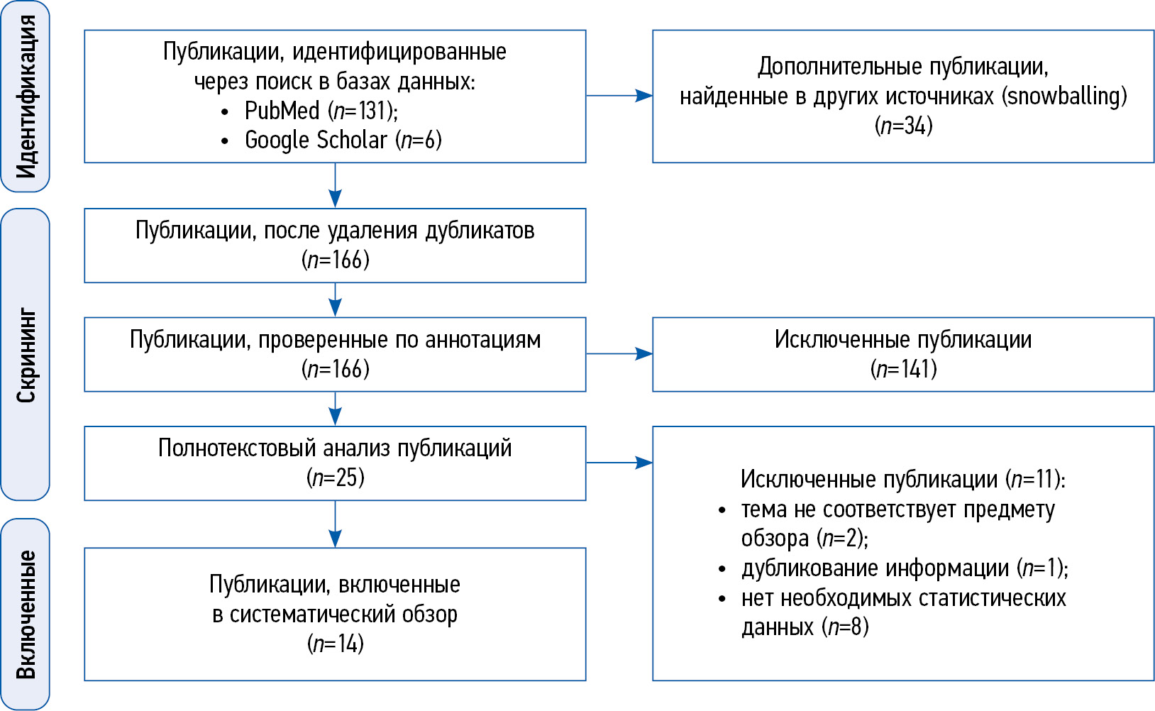 По итогам отбора получено 14 статей, удовлетворяющих критериям соответствия. Потоковая диаграмма, иллюстрирующая процесс отбора научных статей, представлена на рис. 1.