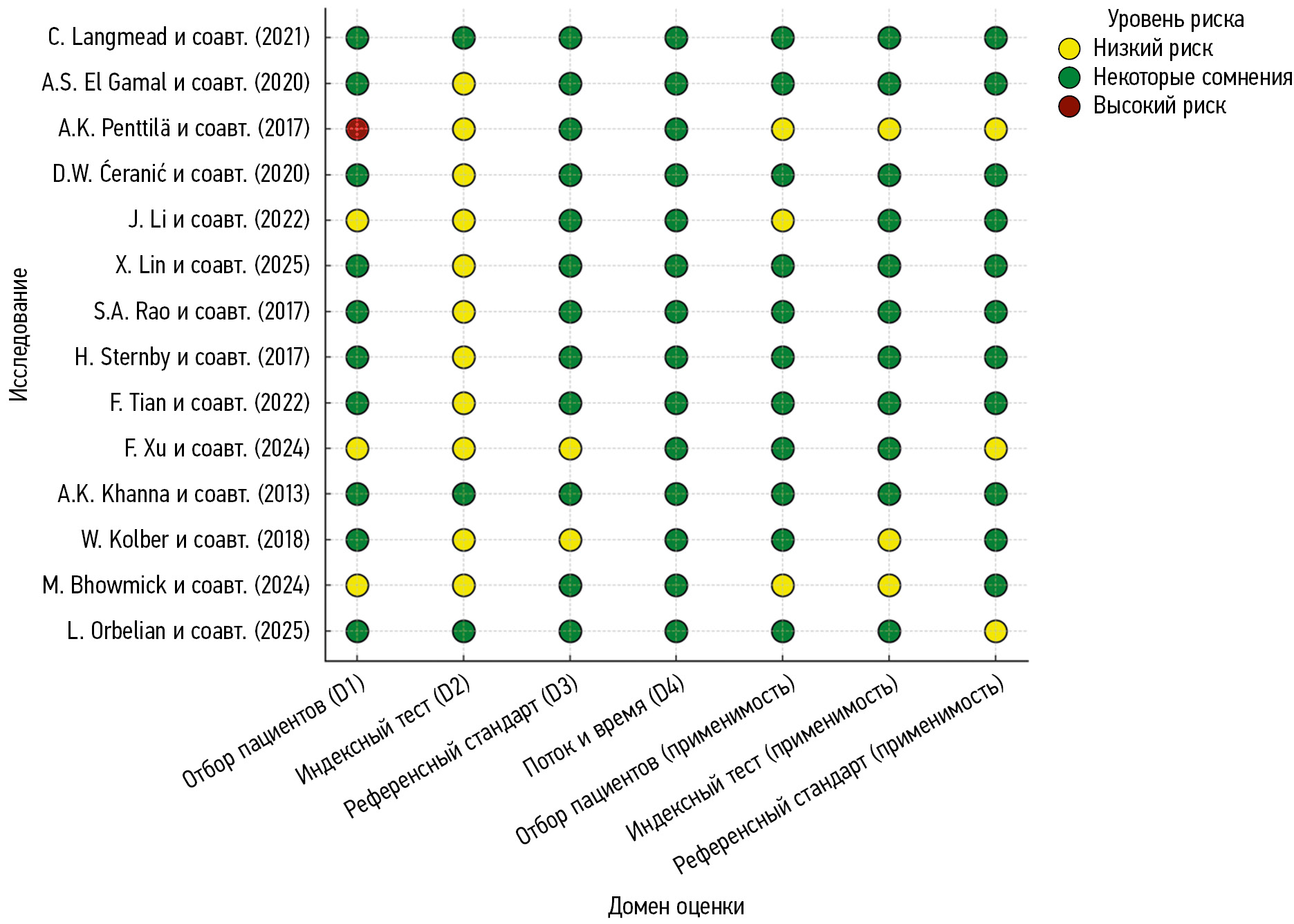 Независимо друг от друга два исследователя определили риск систематической ошибки включенных исследований, используя метод оценки качества исследований диагностической точности (QUADAS-2) [18].