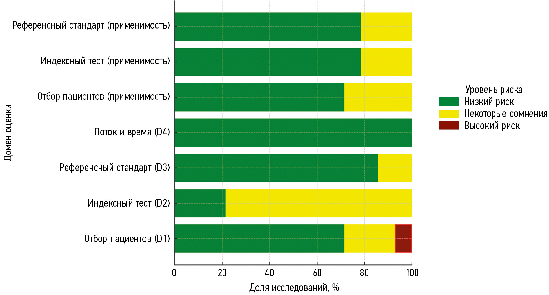 Результаты оценки качества с помощью инструмента QUADAS-2 приведены на рис. 2 и 3.