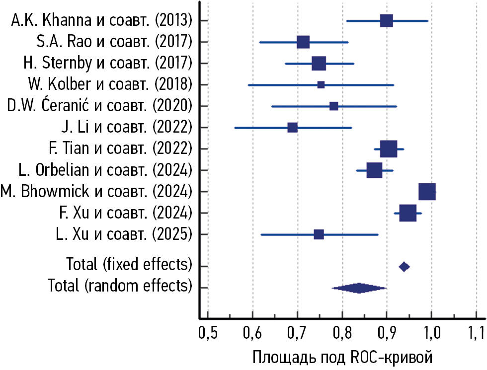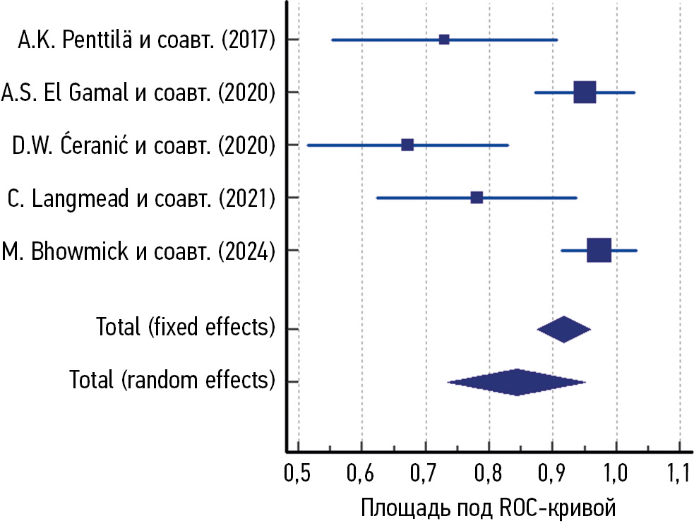 Для наглядности на рис. 4 представлена форест-диаграмма, где показаны оценки AUC и 95% ДИ каждого исследования, а также объединенные эффекты по фиксированной и случайной моделям.