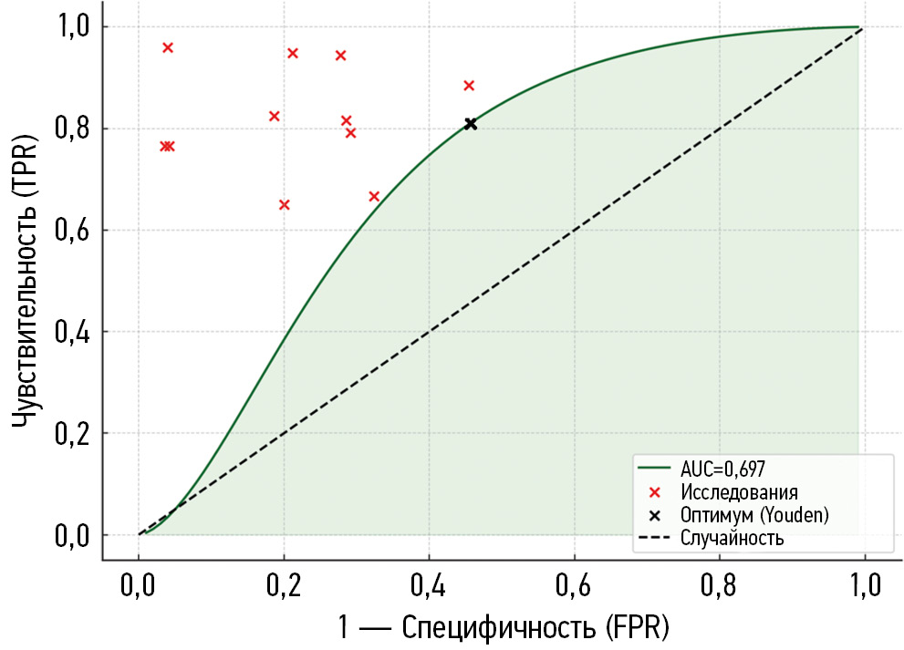 Публикационное смещение и эффект малых исследований оценивали с помощью теста Эггера и анализа воронкообразных диаграмм [19]. Степень достоверности доказательств была выявлена методом GRADE. Построены иерархические обобщенные ROC-кривые (HSROC-кривые) и вычислена AUC. Гетерогенность оценивали с помощью χ²-теста (Q) и статистики I2. Чтобы определить устойчивость полученных результатов анализировали чувствительность с поэтапным исключением отдельных исследований. Рассчитаны значения объединенной AUC и гетерогенности (I2) с поочередным удалением каждого исследования (проведен leave-one-out анализ). Для выявления возможных источников вариабельности дополнительно выполняли метарегрессию.