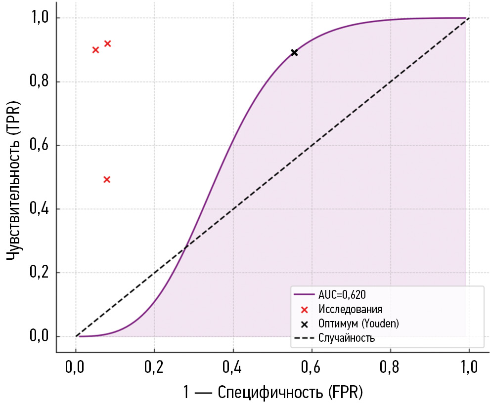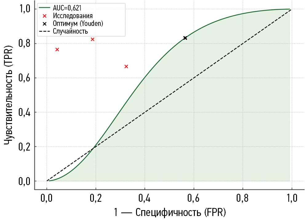 В результате метаанализа получено высокое суммарное значение AUC, превышающее 0,80 в обеих моделях, что указывает на общую высокую диагностическую способность теста (ИЛ-6) среди рассмотренных работ. При этом существенная гетерогенность результатов означает, что размер эффекта заметно варьирует между исследованиями.