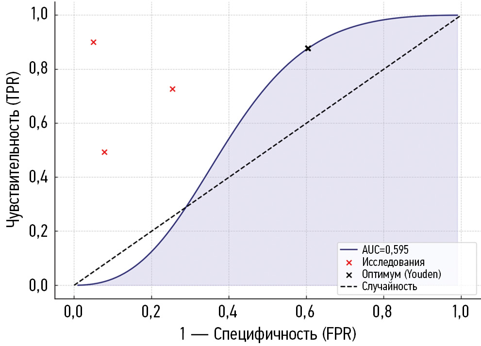 Весь HSROC-анализ выполнен в Python 3.9 (Jupyter Notebook, США) с использованием библиотек pandas и numpy (для обработки данных), scipy (для логит-преобразований и расчета доверительных интервалов), statsmodels (для построения бивариантной модели случайных эффектов, то есть иерархической SROC-модели по Rutter & Gatsonis), scikit-learn (metrics, для вычисления AUC и оптимальной точки по индексу Юдена). Библиотека matplotlib применена для визуализации HSROC-кривой, а также отображения индивидуальных точек исследований и маркировки порога: сначала для каждого исследования рассчитывали чувствительность и специфичность, затем логиты Se и Sp использовали в иерархической модели, по ее параметрам строили сглаженную кривую и по ее AUC оценивали обобщенную точность теста, а оптимальный порог определяли как максимум (Se — FPR1).