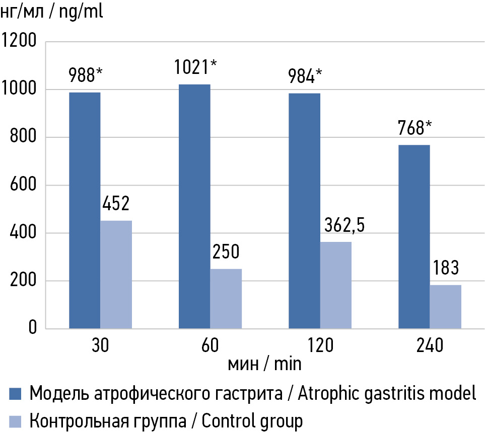 Fig. 5. Amoxicillin concentration in washes from the gastric mucosa of rats from both groups at different time points, Me. * p < 0.01 / Рис. 5. Концентрация амоксициллина в смывах слизистой оболочки желудка крыс разных групп в разных временны´х точках, Me. * различия с уровнем значимости p < 0,01