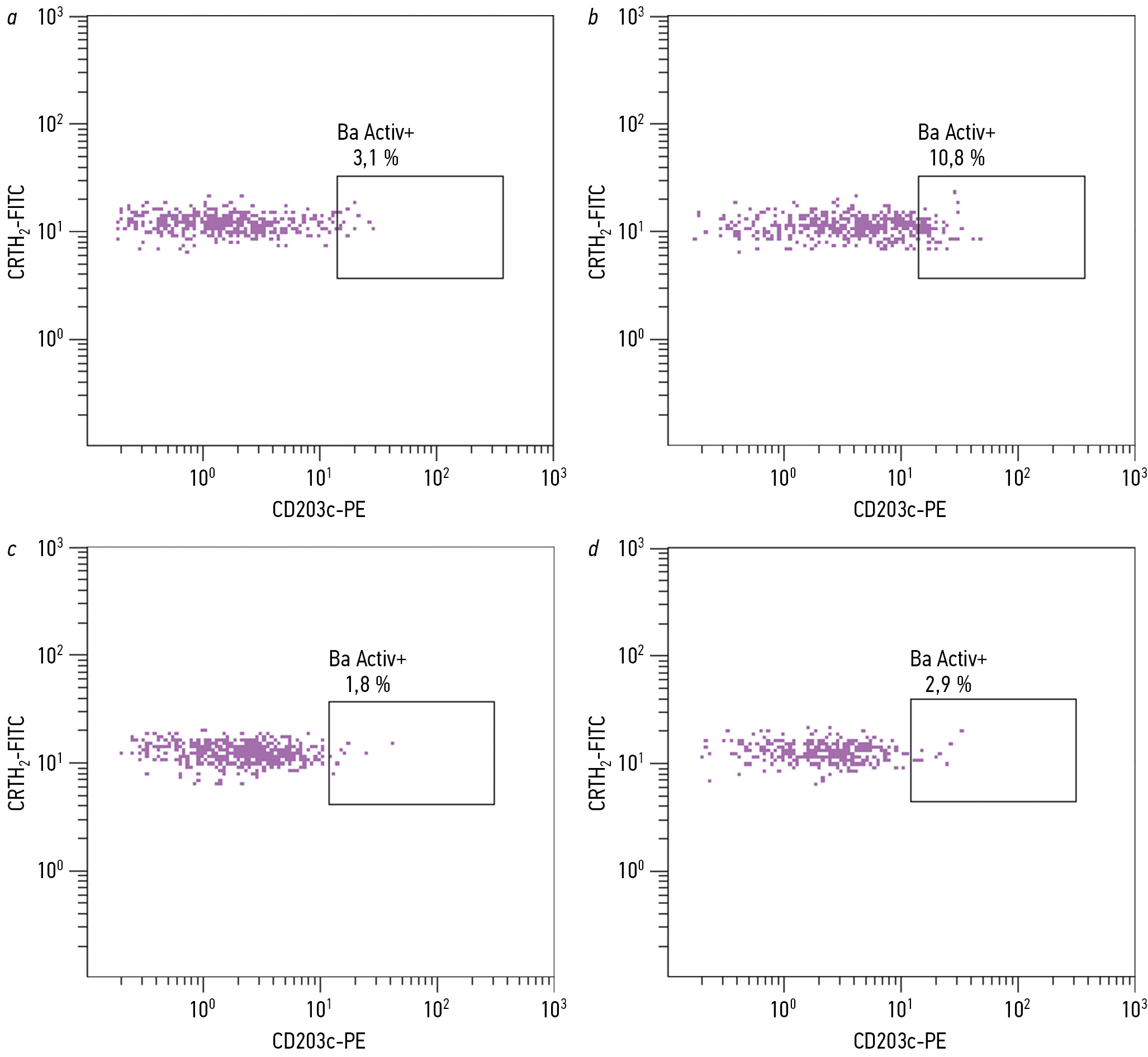 Fig. 1. Basophil activation test in patients with asthma. Patients С. (а, b) and patients D. (c, d) at the final basophil gaiting (CD3–CRTH2+CD203++) after the spontaneous (a, c) and specific Aspergillus fumigatus (b, d) activation. High percentage of the activated basophils (b) confirms the sensibility / Рис. 1. Тест активации базофилов у больных бронхиальной астмой. Пациент С. (а, b) и пациент Д. (c, d) на этапе итогового гейтирования базофилов (CD3–CRTH2+CD203++) после спонтанной (a, c) и специфической Aspergillus fumigatus (b, d) активации. Большая доля активированных базофилов (b) подтверждает наличие сенсибилизации