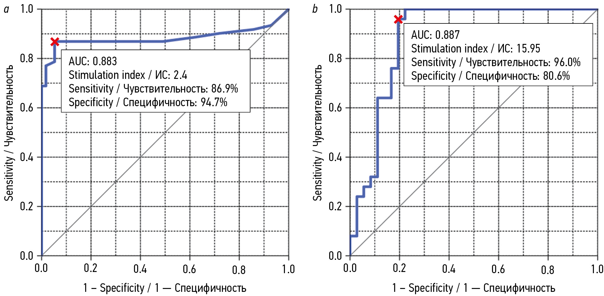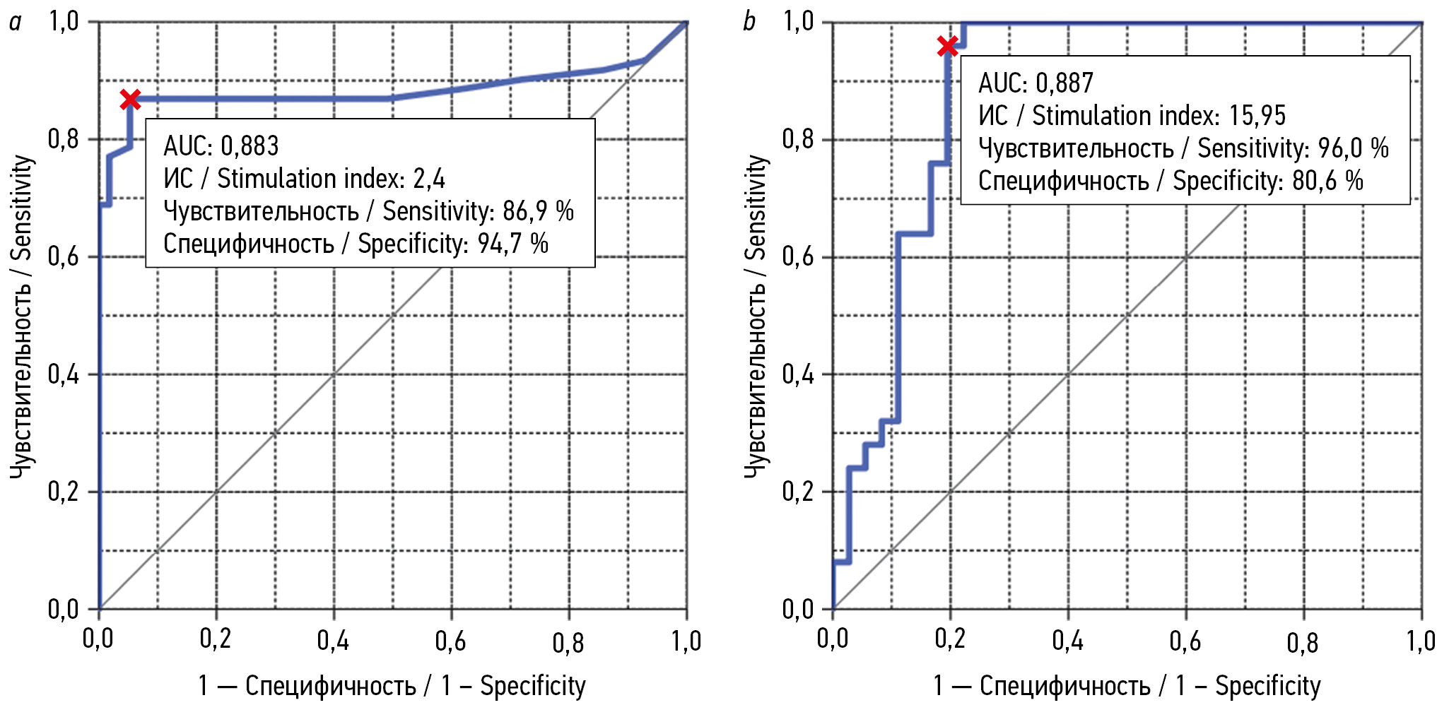 Fig. 2. ROC curves illustrating the optimal cut off points of the index stimulation to detect sensitization to Aspergillus spp. patients with asthma (a) and ABPA (b) / Рис. 2. Кривые ROC, иллюстрирующие оптимальные точки отсечения (cut off) индекса стимуляции (ИС) для выявления сенсибилизации к Aspergillus spp. у больных бронхиальной астмой (a) и аллергическим бронхолегочным аспергиллезом (b)