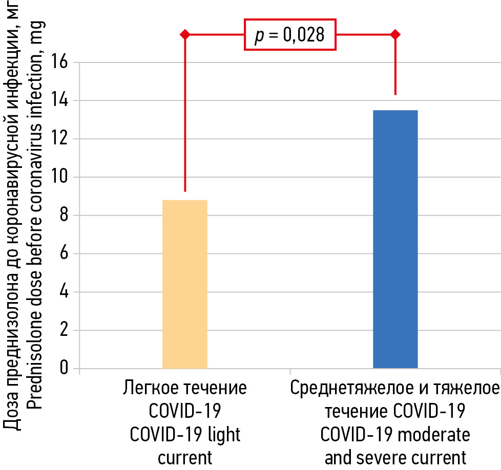 Рис. 1. Влияние терапии глюкокортикоидами на степень тяжести COVID-19 при иммуновоспалительных ревматических заболеваниях (n = 324)