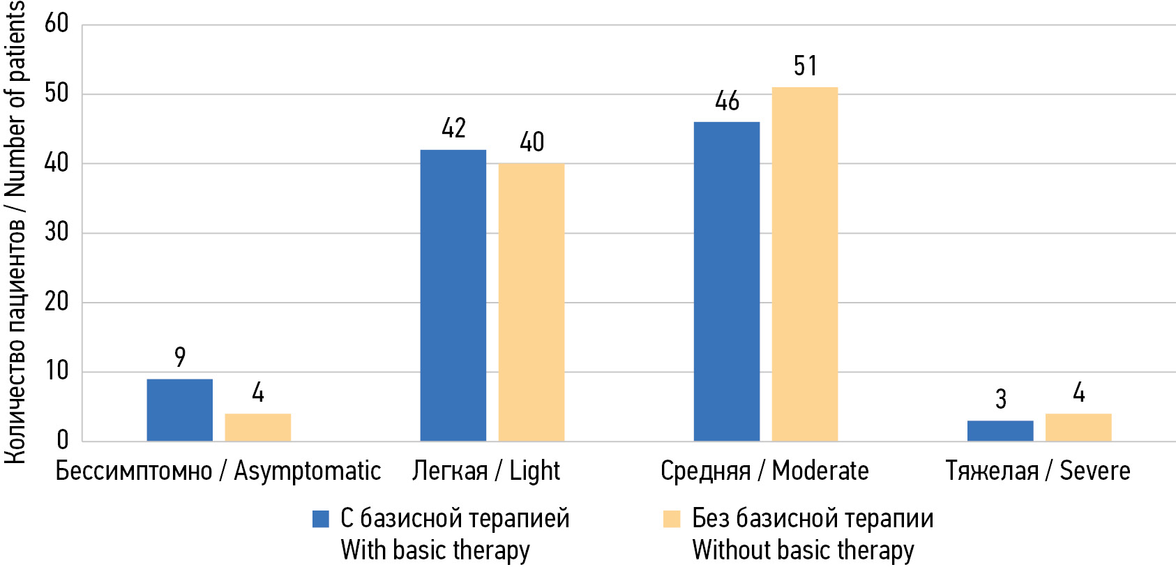 Анализ показал, что прием базисной терапии до развития COVID-19 существенно не влиял на степень тяжести НКИ (рис. 2).