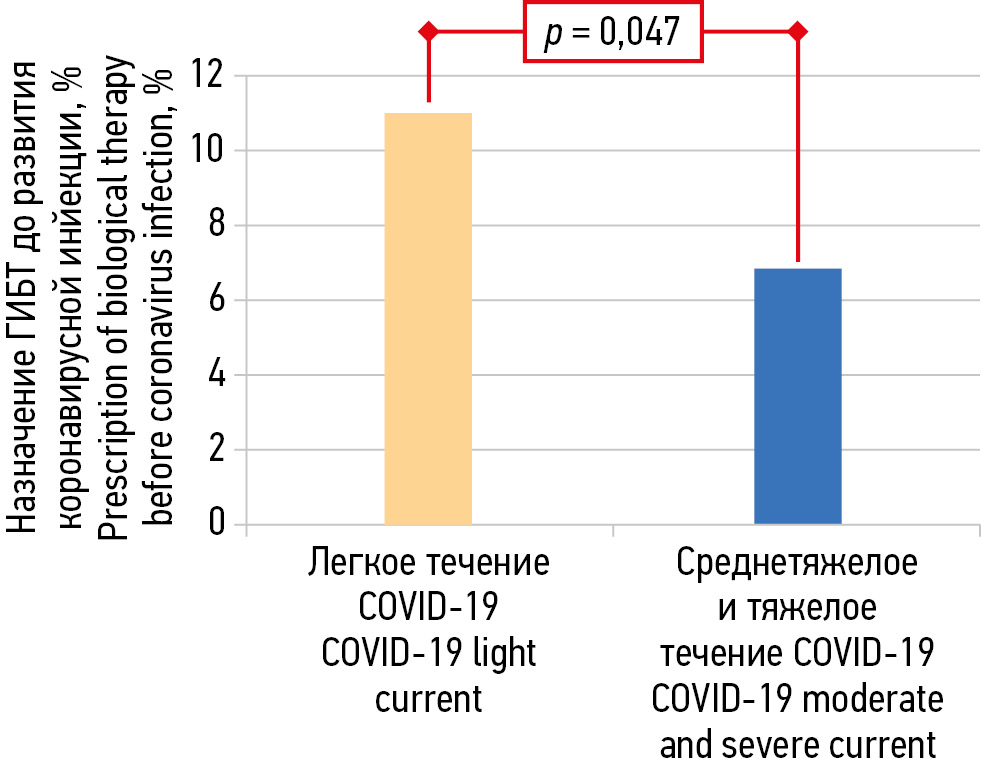 Важным оказалось то, что пациенты, получавшие генно-инженерные биологические препараты и таргетные средства (упадацитиниб) до НКИ, переносили ее преимущественно в легкой форме, COVID-19 средней степени тяжести и тяжелого течения в данной группе пациентов встречался достоверно реже (р = 0,047) (рис. 3). Тем не менее мы не обнаружили корреляционных связей между вероятностью развития тяжелого течения НКИ и такими факторами риска, как индекс массы тела, активность РА (кроме уровня СОЭ).