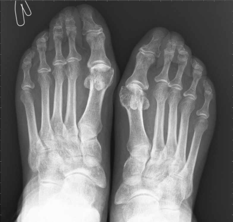 The joint spaces in the interphalangeal joints and metatarsophalangeal joints of both feet are moderately narrowed, with moderate periarticular osteoporosis. Subluxations were not identified. A single cyst-like lucency was found in the metatarsophalangeal joints. Hallux valgus of the first toes of both feet, without erosion data (see Fig. 5).