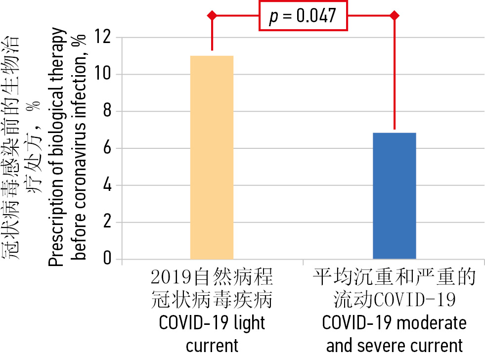图 2 免疫炎症性风湿病患者COVID-19的严重程度,取决于在COVID-19之前使用的基础疗法