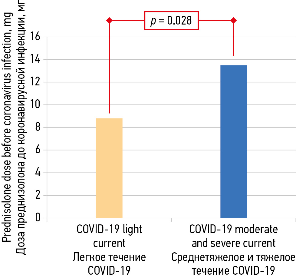 Fig. 1. Effect of glucocorticoid therapy on COVID-19 severity in immunoinflammatory rheumatic diseases (n = 324) / Рис. 1. Влияние терапии глюкокортикоидами на степень тяжести COVID-19 при иммуновоспалительных ревматических заболеваниях (n = 324)